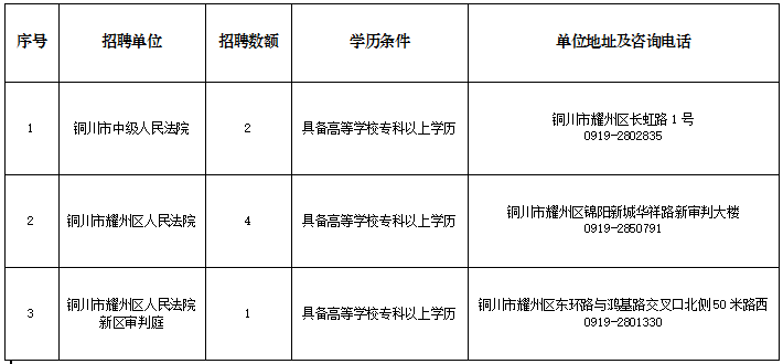 根據(jù)工作需要及相關(guān)政策規(guī)定,經(jīng)陜西省高級人民法院批準(zhǔn),銅川市法院系統(tǒng)面向社會公開招聘聘用制書記員?,F(xiàn)將有關(guān)事項公告如下: